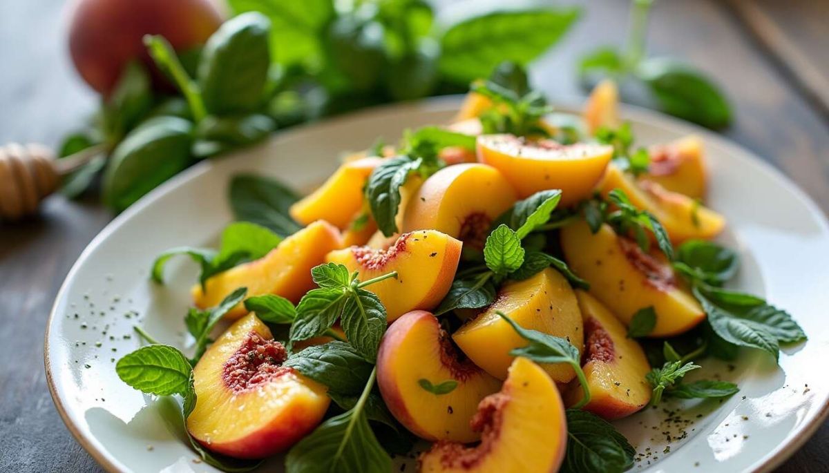 Cette recette met en lumière l'harmonie entre la douceur des pêches et la fraîcheur des herbes comme la menthe et le basilic. Un exemple parfait d'équilibre entre simplicité et sophistication.