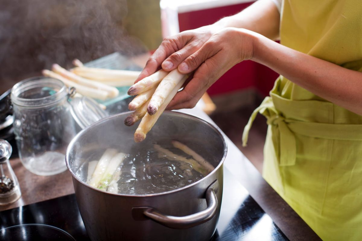 - Faites cuire les asperges dans l'huile à 130 °C jusqu'à ce qu'elles soient tendres.