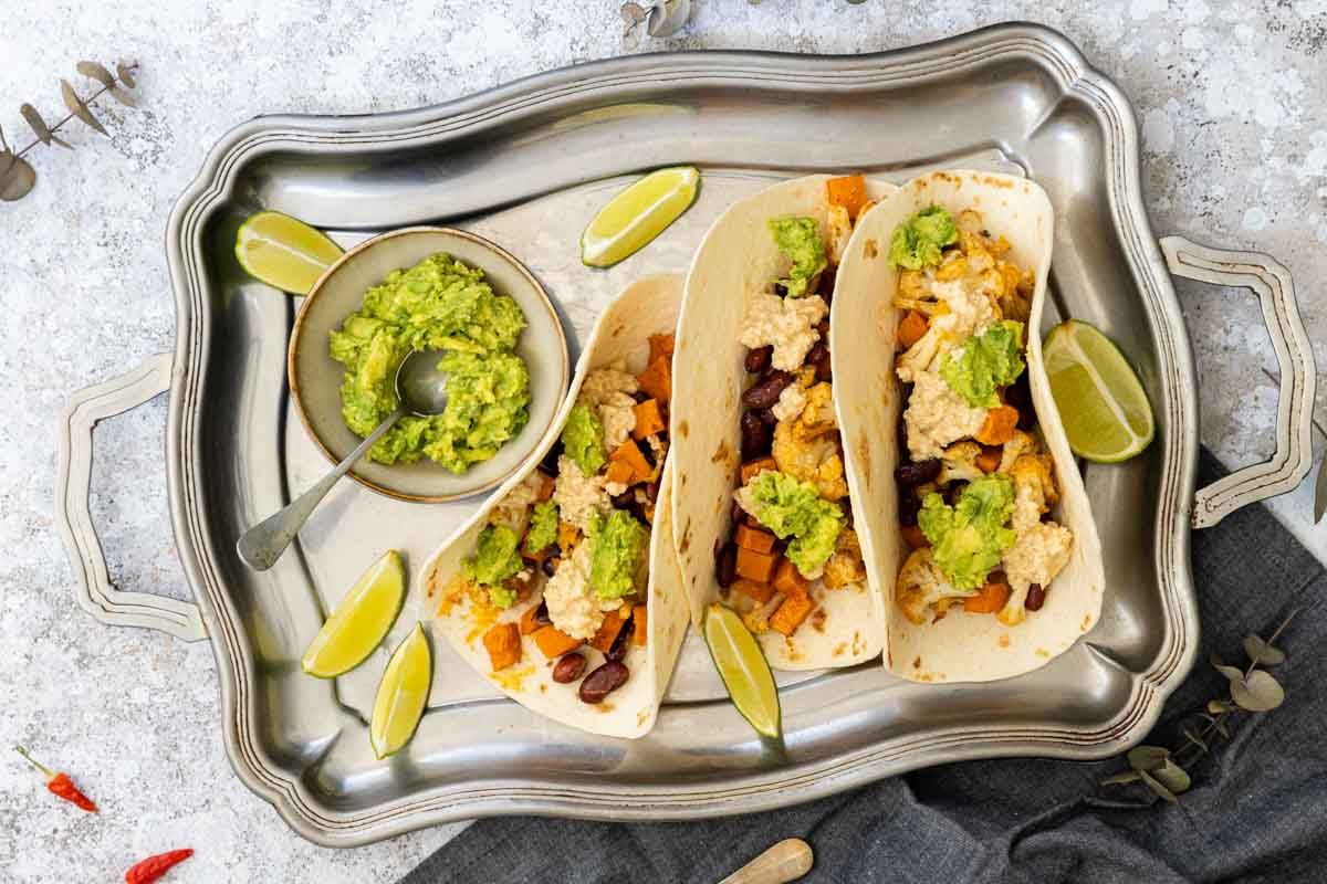 - Garnissez les tortillas avec les légumes rôtis, un peu de purée d'avocat et nappez de la sauce aux noix de cajou.