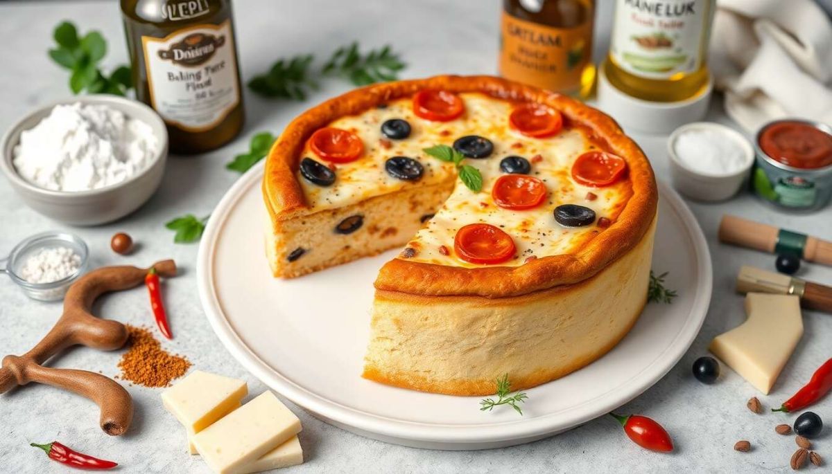 Disposez ce cake sur une planche en bois rustique pour un style méditerranéen. Coupez-le en tranches égales et décorez avec quelques olives noires pour un effet visuel optimal.