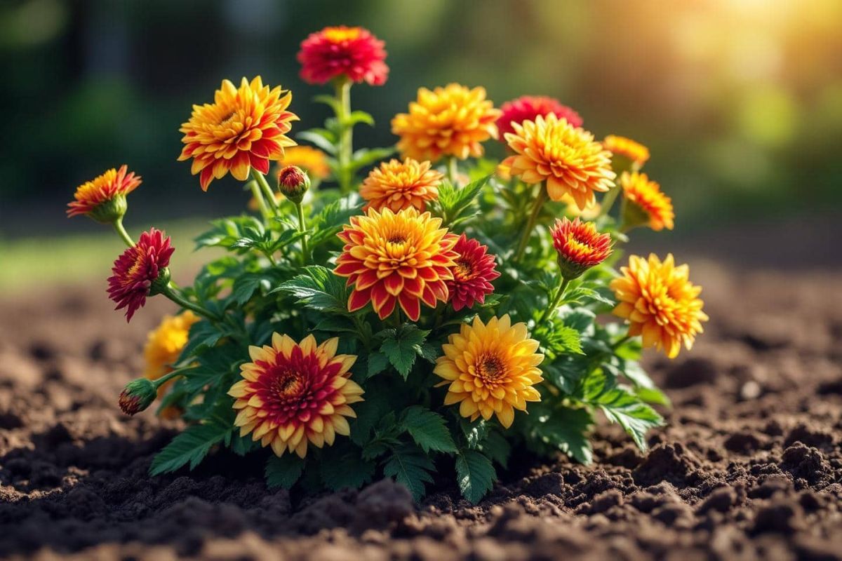 Avant de planter, ameublissez le sol sur 20 cm et intégrez du compost pour nourrir vos jeunes plants. Pensez à espacer les chrysanthèmes de 30 à 40 cm pour un effet harmonieux. Un paillage organique protégera la terre de la chaleur excessive et limitera les mauvaises herbes.