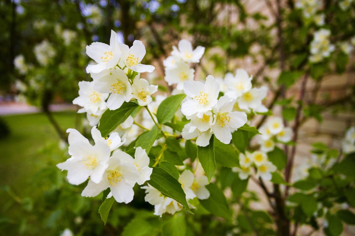 - Philadelphus lewisii : arbuste aux fleurs simples, très parfumées, réunies en grappes.