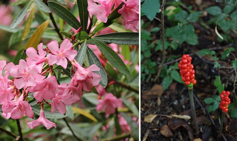Le laurier-rose (Nerium oleander) est une plante très prisée dans les climats doux. Cependant, tous ses éléments sont toxiques. Les glycosides cardiotoniques qu’elle renferme peuvent engendrer douleurs abdominales et vomissements.