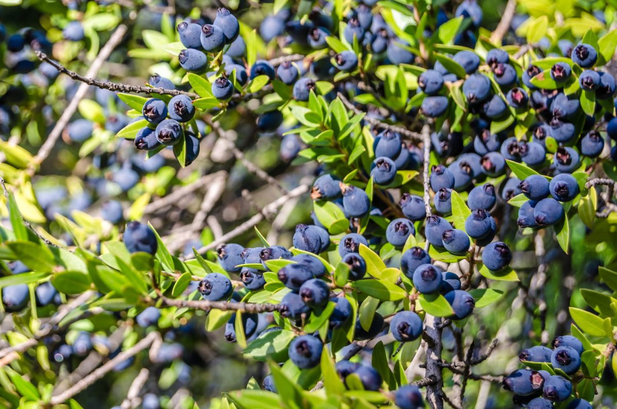 Mesurant entre 1 et 3 mètres de haut, le myrte présente de petites feuilles ovales, vert foncé et persistantes. En froissant les feuilles, vous découvrirez leur parfum résineux, signature de cette plante. Pendant la période de floraison, de petites fleurs blanches ou roses se forment, suivies de fruits aux reflets bleus qui rappellent le goût du genévrier.
