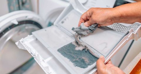 Tout comme le sèche-linge, la machine à laver nécessite également un nettoyage de son filtre, bien que cela ne soit pas nécessaire à chaque utilisation. Ce dernier se trouve souvent en bas à droite de la façade de l'appareil. Ouvrez la trappe, placez une serviette en dessous et dévissez le filtre. Préparez-vous à quelques éclaboussures d'eau ! Nettoyez le filtre avec un chiffon et revissez-le une fois sec.