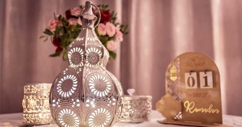 Pour la décoration, choisissez des éléments qui apportent une touche de chaleur sans surcharger la table. Une nappe ou un chemin de table peut servir à la fois de protection et d’élément décoratif. Pour un style minimaliste, des teintes beige ou vert clair s'accorderont parfaitement avec des assiettes assorties. Des bougies et lanternes en forme de croissant de lune ajoutent une ambiance douce et festive. Pensez aussi à des décorations en bois évoquant le Ramadan, à poser sur la table ou un buffet, et des plats en forme de croissant pour accueillir vos dattes.